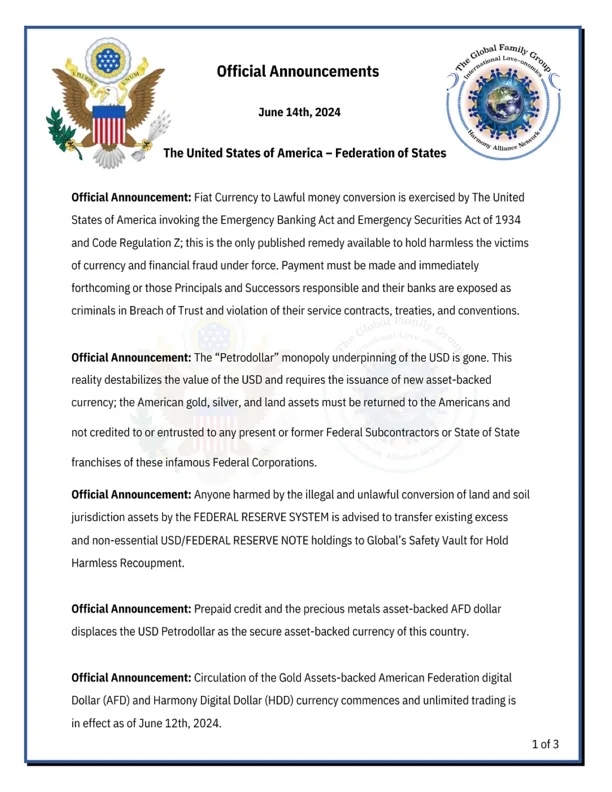 1. The U.S. is invoking emergency acts to convert fiat currency to lawful money, holding responsible parties accountable. |