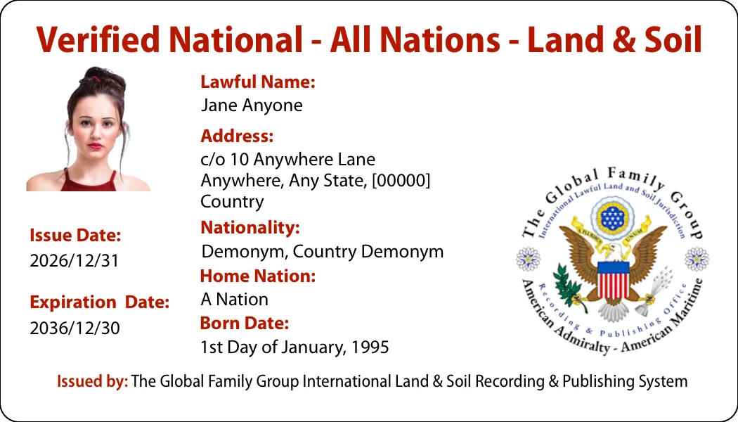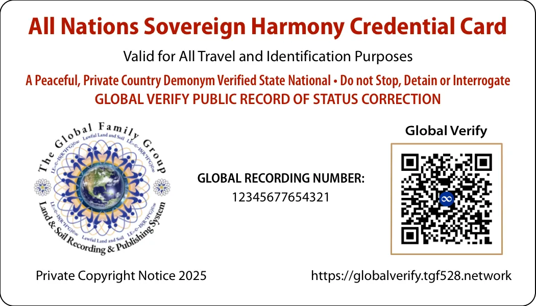 We now have the Global Credential Card to provide Global Worldwide Identification and to represent the identity and true value for all living people. This card provides the freedom of worldwide travel through Status Correction and freedom without borders for all living people. |